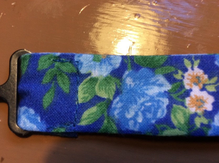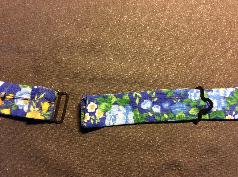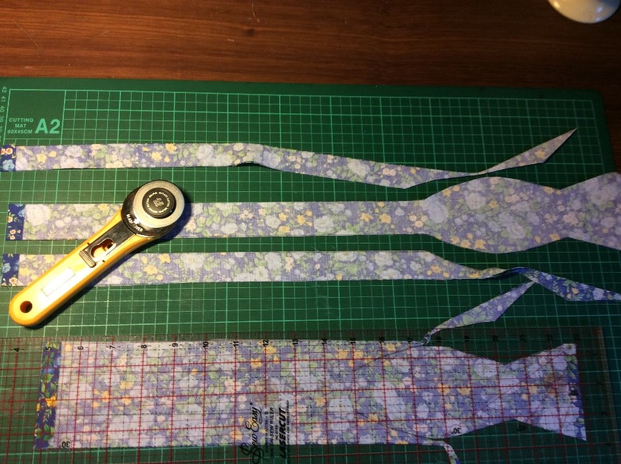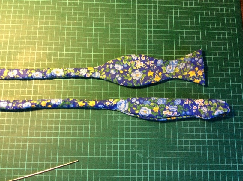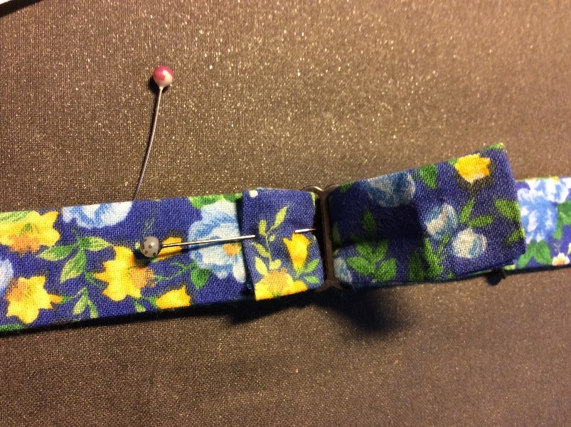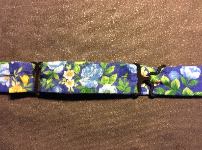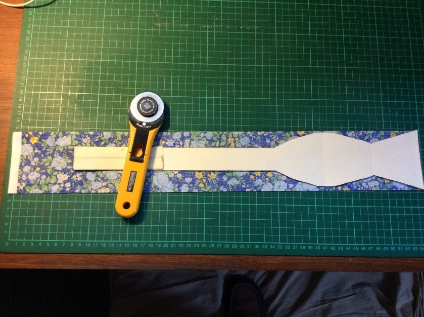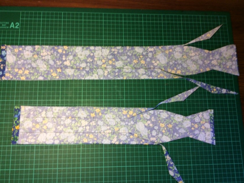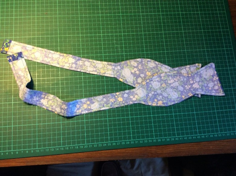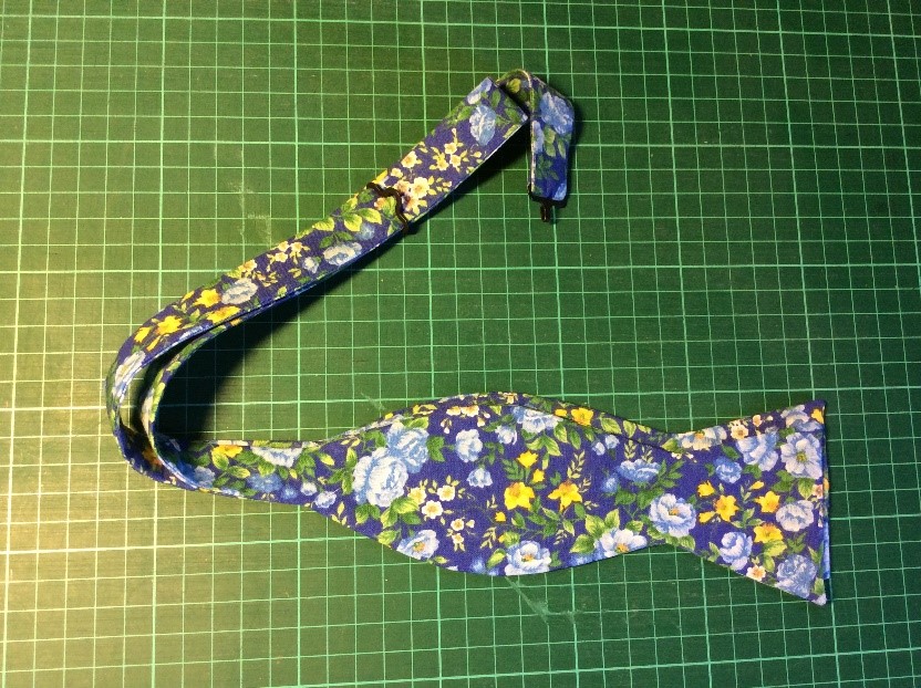 Cut a strip 6 ½” wide the width of the fabric, folded in half. I’m using quilting rulers. Trim straight, removing the selvedge. Press in half lengthwise to create a double piece 3 ¼” wide. Cut light, fusible interfacing the same width as the fabric Press and fold the ends a couple of centimetres, staggering slightly. Press the interfacing to the fabric.Place the long template on the fabric and draw around, I use a 6B pencil. Fold the template and cut the shorter side. Trim the curved part with scissors. Cut the straight part with a rotary cutter Stitch around with a ¼” seam, leaving the small end open. Snip the curves. Turn right side out. I use a ‘Turn-It-All’, makes the job easy. Push it through with the poking stick. Use a fine poker to push out the corners, run it along the seam to push them out. Thus. Press and turn the end over with the staggered side underneath. I use this set to assemble the two pieces, Very inexpensive, they are really for ready-made bowties but work perfectly for this. Put the shorter piece through the double loop. Slip the hook onto the larger piece, facing to the back. Slip the larger side through the double loopThus. I sew down the fold and then across, holding it with a stiletto, this stops looping. Finished seam. Top Finished
