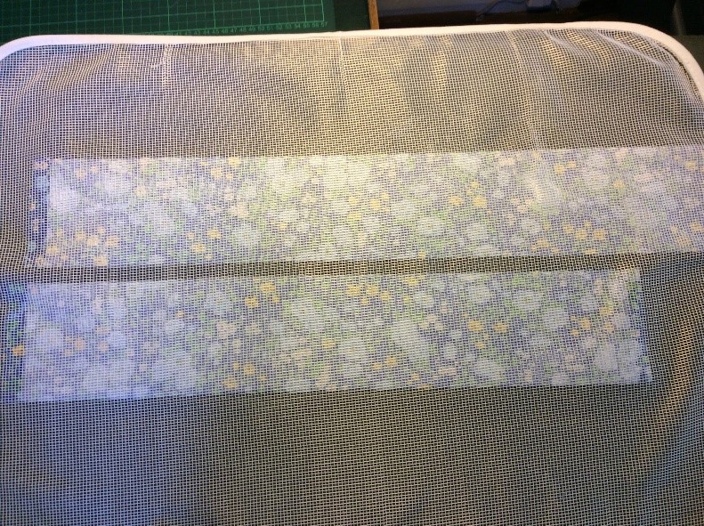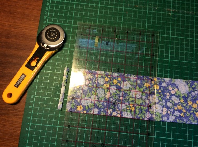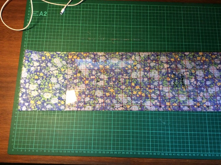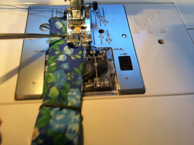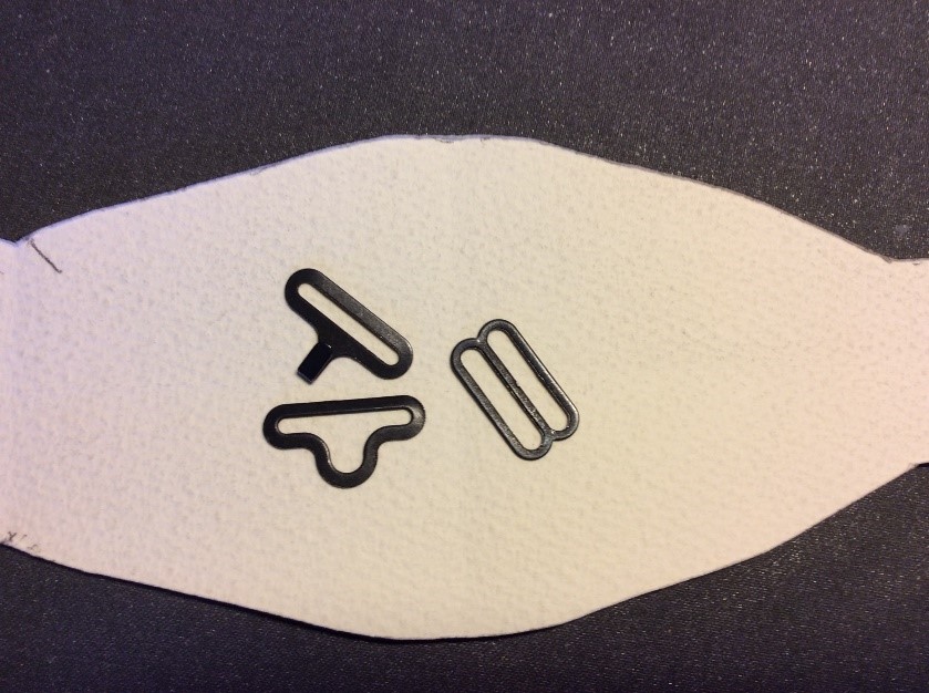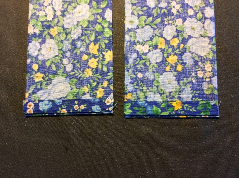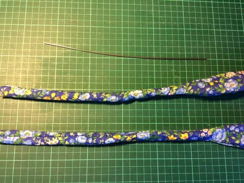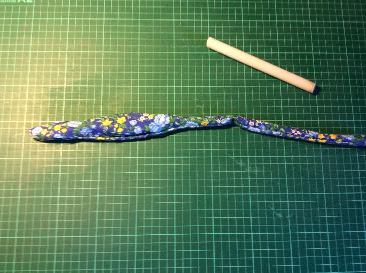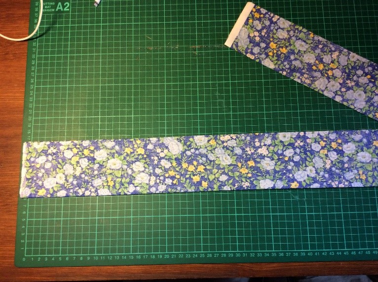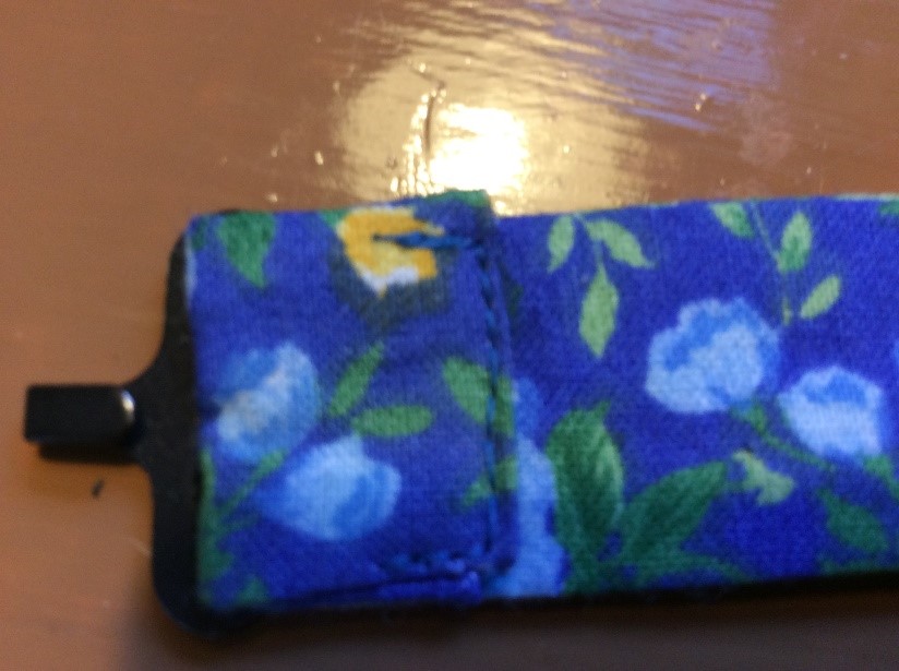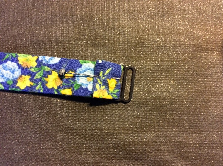 Cut a strip 6 ½” wide the width of the fabric, folded in half. I’m using quilting rulers. Trim straight, removing the selvedge. Press in half lengthwise to create a double piece 3 ¼” wide. Cut light, fusible interfacing the same width as the fabric Press and fold the ends a couple of centimetres, staggering slightly. Press the interfacing to the fabric.Place the long template on the fabric and draw around, I use a 6B pencil. Fold the template and cut the shorter side. Trim the curved part with scissors. Cut the straight part with a rotary cutter Stitch around with a ¼” seam, leaving the small end open. Snip the curves. Turn right side out. I use a ‘Turn-It-All’, makes the job easy. Push it through with the poking stick. Use a fine poker to push out the corners, run it along the seam to push them out. Thus. Press and turn the end over with the staggered side underneath. I use this set to assemble the two pieces, Very inexpensive, they are really for ready-made bowties but work perfectly for this. Put the shorter piece through the double loop. Slip the hook onto the larger piece, facing to the back. Slip the larger side through the double loopThus. I sew down the fold and then across, holding it with a stiletto, this stops looping. Finished seam. Top Finished