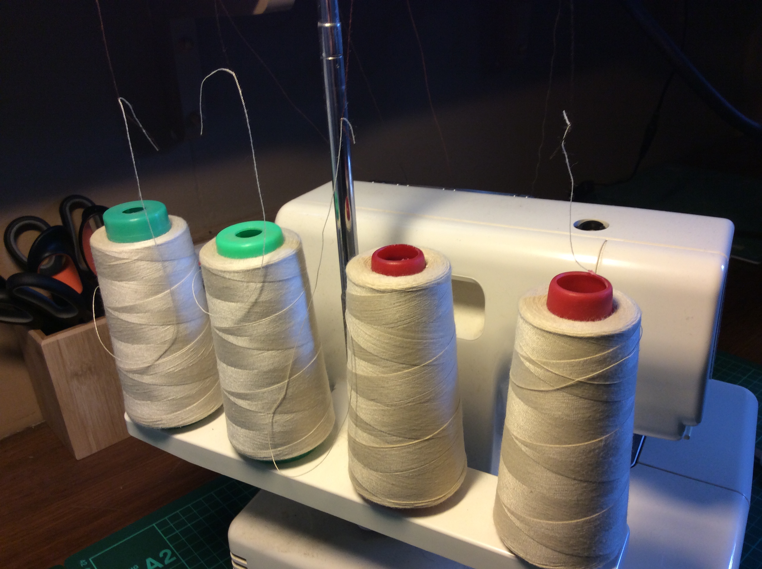Instead of taking out threads and replacing them, cut the previous colour and attach the new – then sew it through the machine. I always try to stop the needle threads going through the eye but seldom make it in time, it hasn’t done any damage but goes through easily. Tie the threads with a REEF knot, not a GRANNY as the granny will slip.