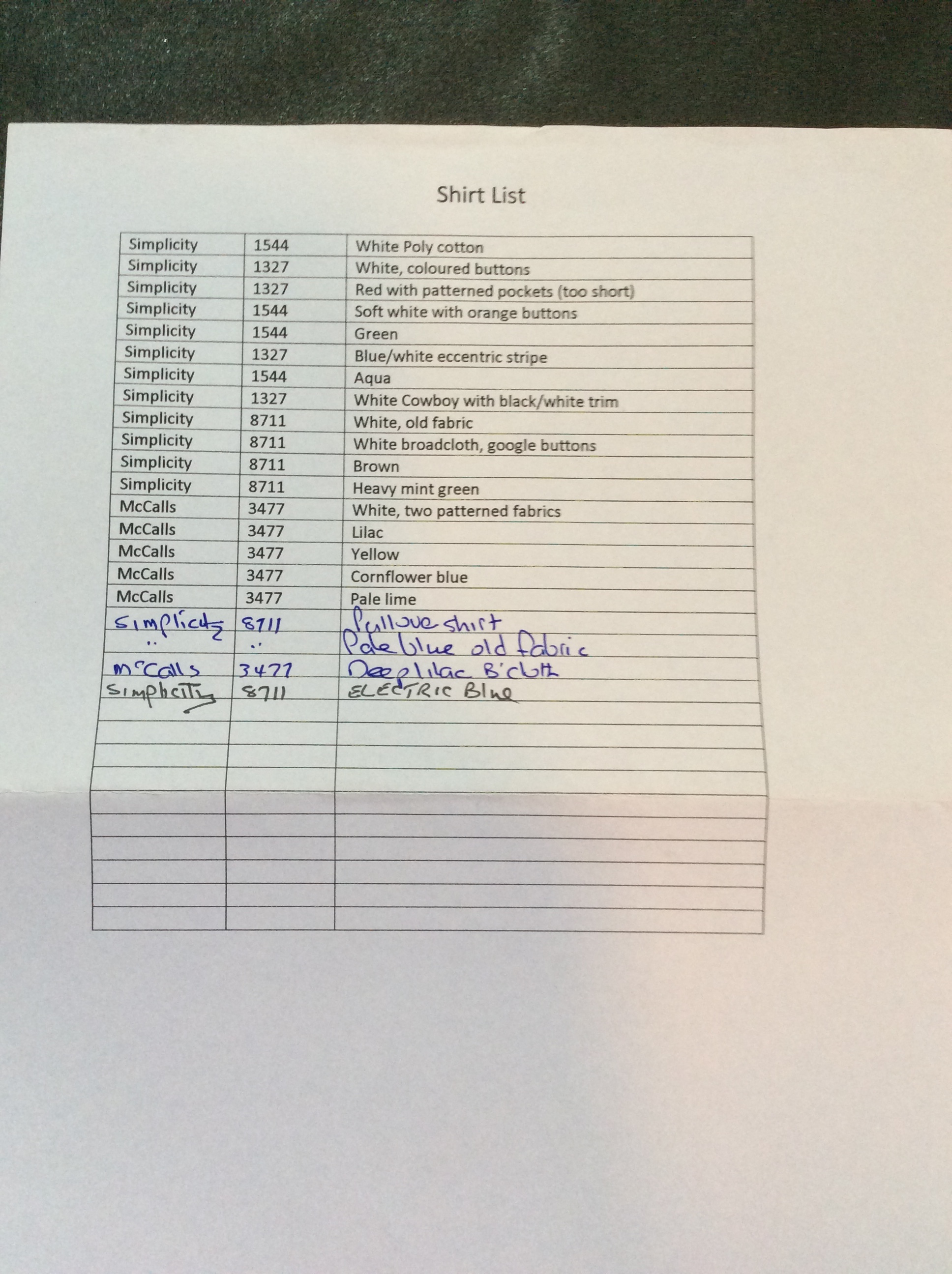 I make a list of which pattern I used for each shirt, I was using Simplicity 8711, a 1979 pattern a lot, so decided to use it for my block shirt.