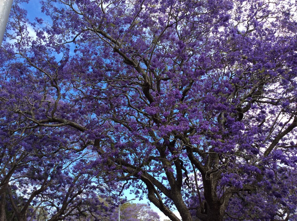 The skyline is a mixture of purple Jacaranda and crimson Poinciana now, a wonderful sight.