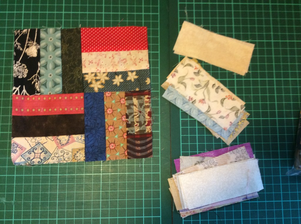 These are my tiny pieces of fabric, (What a blurry photograph, too early in the morning) I use them to make ‘Roman Road’ quilts – they can’t get any smaller than this. I also give pieces to other quilters as well, I’ve been doing that a lot lately because I haven’t been quilting – I have a backlog to finish.