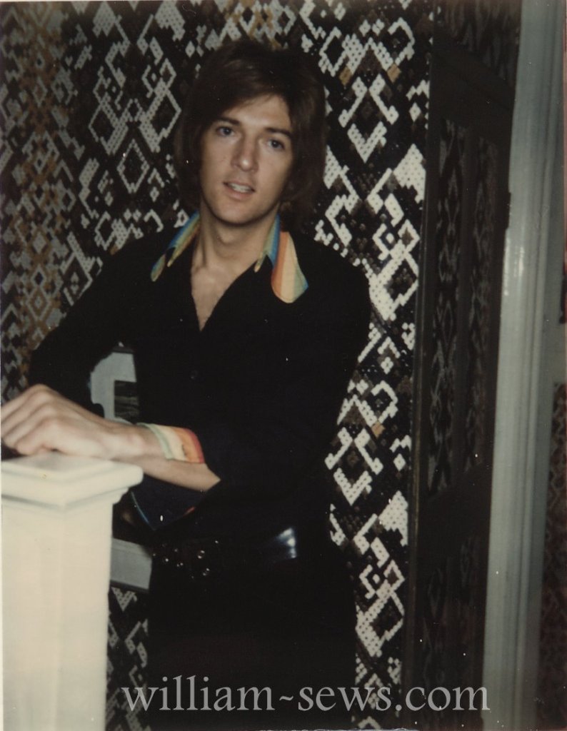 I made this shirt and trousers in the 1970s; a black shirt with rainbow cuffs and collar – a big collar, and black silky pants.