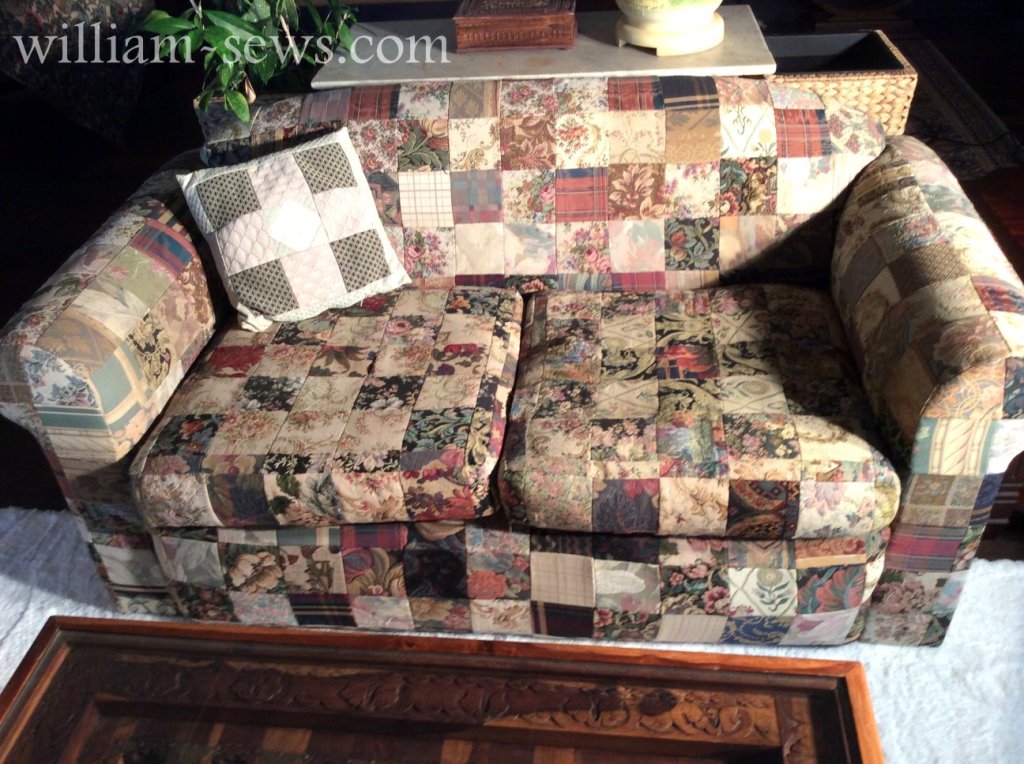I also tried upholstery, I had a pile of tapestry samples and decided to make enough patchwork fabric for two settees.