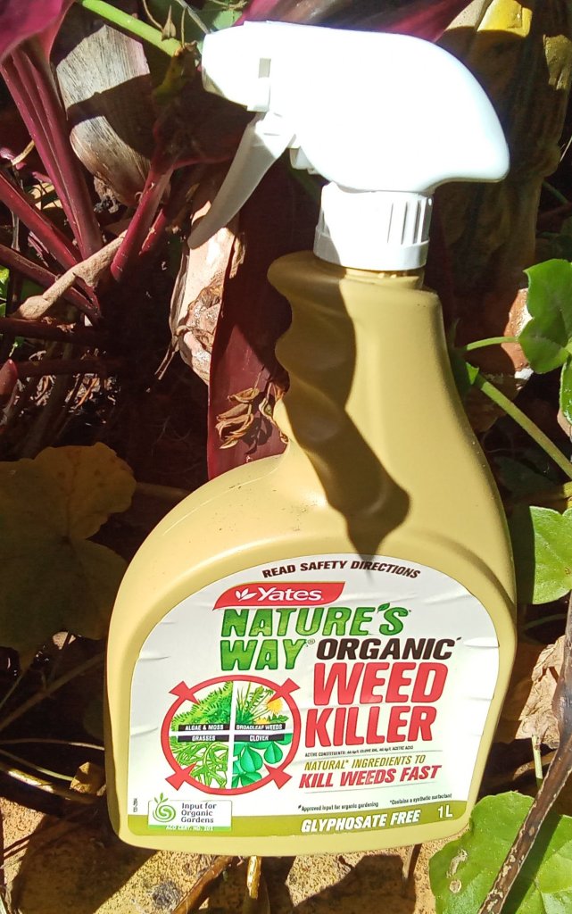 Other ready-made products are Bioweed and Nature’s Way, the names sound ‘green’. I haven’t been able to buy Bioweed locally but Nature’s Way is excellent for killing encroaching runners from the Buffalo lawn into the garden beds, just a squirt (being careful not to hit the plants) and it dies back overnight and it doesn’t kill the soil like the other mix.