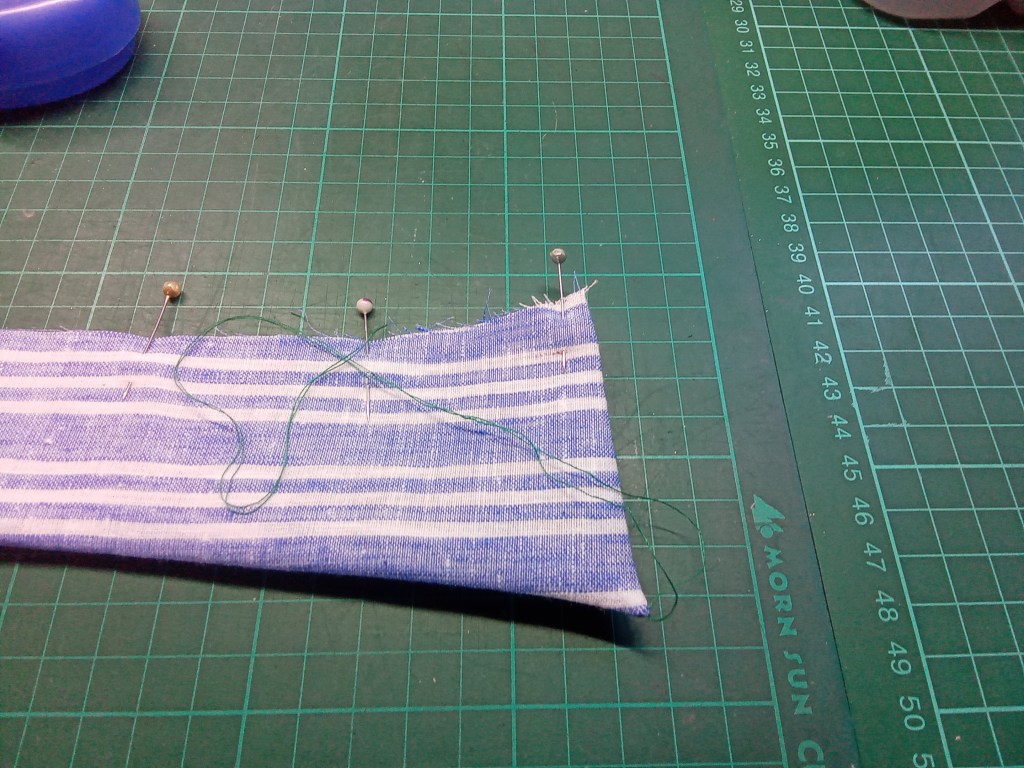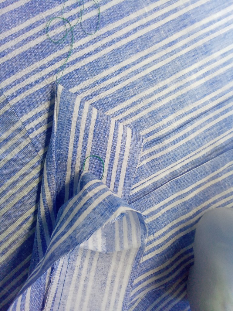The bottom of the pockets are rounded and the best way to do that is to sew a basting thread close to the edge of the rounded part and gently gather it.