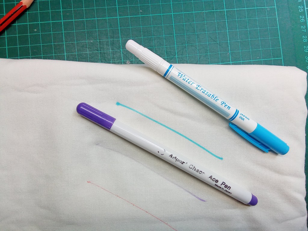 These are water erasable and are OK to draw around a pattern or on the wrong side of a piece, but I wouldn’t use them where the marking will show. The top one has a little brush in the other end to wet and remove the markings.